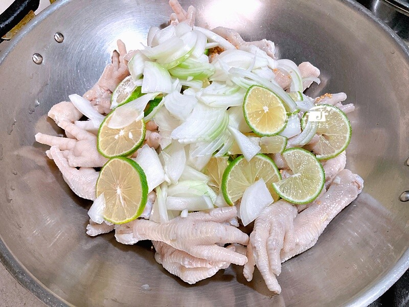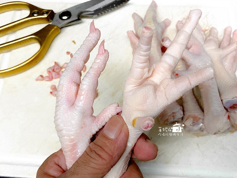 1買回來的雞腳先用剪刀或用菜刀剁除腳爪,再把腳掌上的縫隙和皺褶清洗乾淨瀝乾水分備用