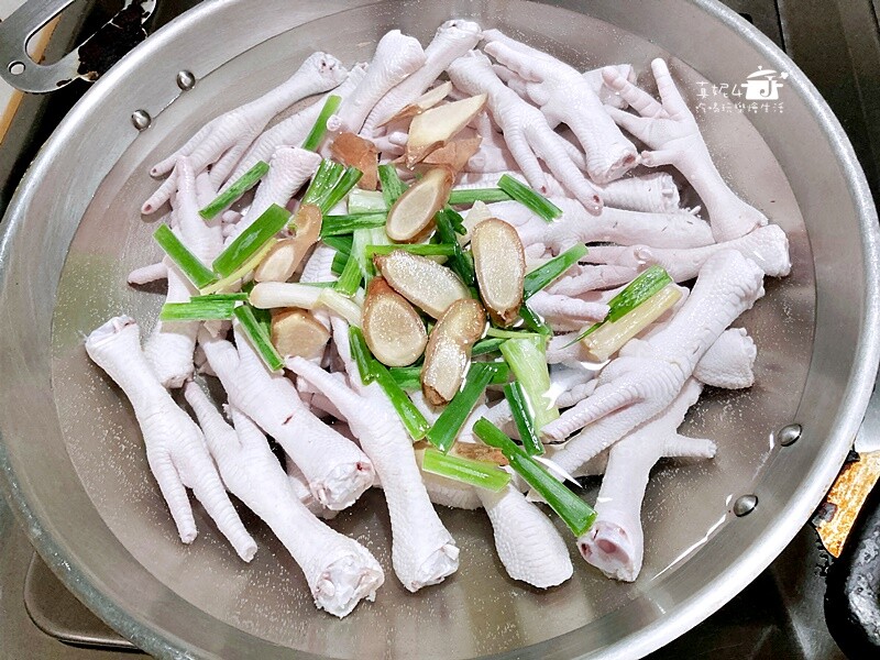2.炒鍋裝水,放入雞腳/蔥/薑/米酒煮,今天有3斤的份量我煮20分鐘就撈起來沖洗了
