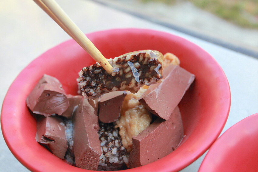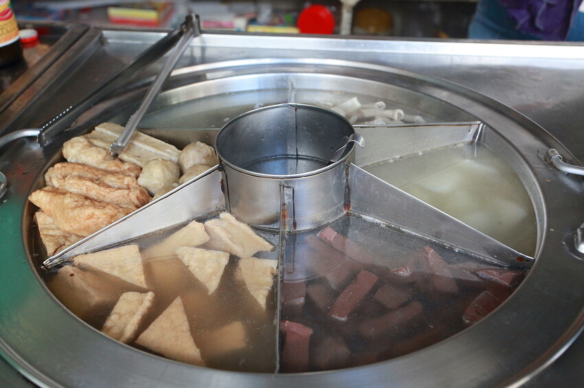 攤位前面掛著菜單有油豆腐、肝連肉、菜頭、黑輪、豬血、魚板、小腸、貢丸、米血及豆皮等,其中肝連肉小腸包蛋黑輪三樣是每份15元,其餘菜色均一價每份售價是10元。