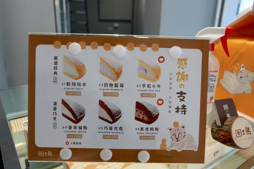 冷藏櫃上有放菜單供顧客參考,每個波士頓派都是8吋尺寸,菜單以可愛的模式來取名,有軟綿綿羊240元、豹抱藍莓260元、芋尼小牛280元、香草貓熊260元、巧莓花鹿280元及黑皮熊熊290元等六種口味。