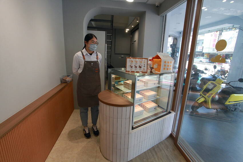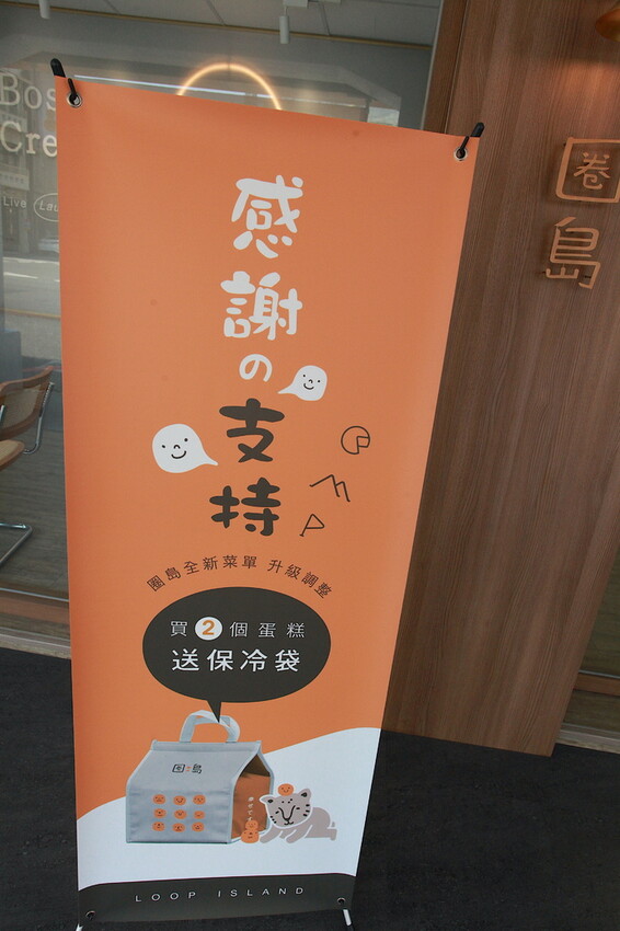 外面有放置人形立牌廣告供顧客參考,現在只要購買兩個蛋糕就送保冷袋一個。