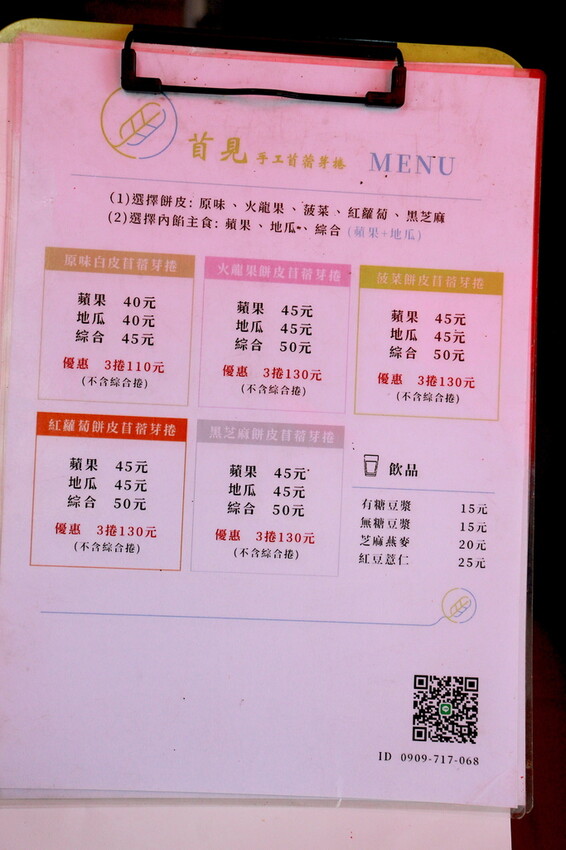 這菜單餅皮有分原味餅皮、火龍果餅皮、菠菜餅皮、紅蘿蔔餅皮及黑芝麻等五樣,內餡主要提供蘋果地瓜及綜合給選擇,還有一些飲品供額外選擇,小高覺得菜單設計太過於複雜。
