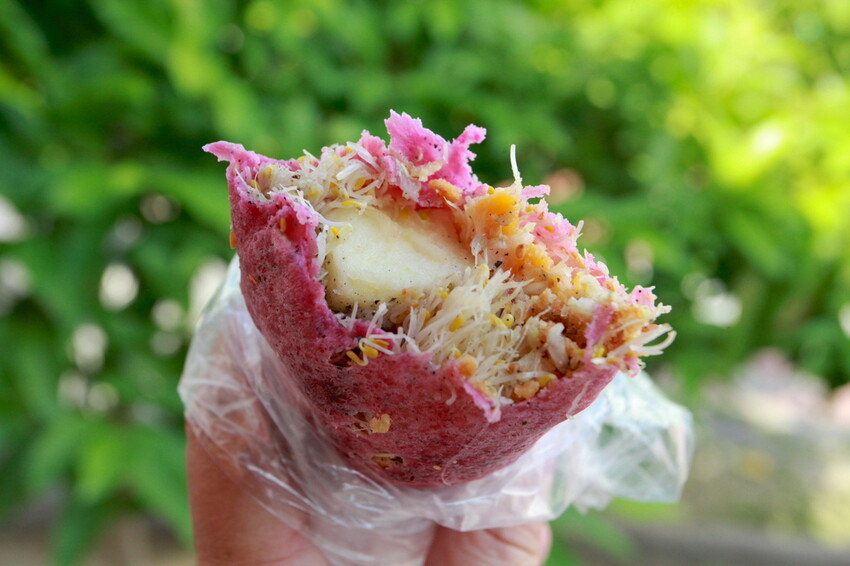 綜合口味就是有添加蘋果與地瓜,裡面還有灑上油炸脆餅與梅子粉吧!