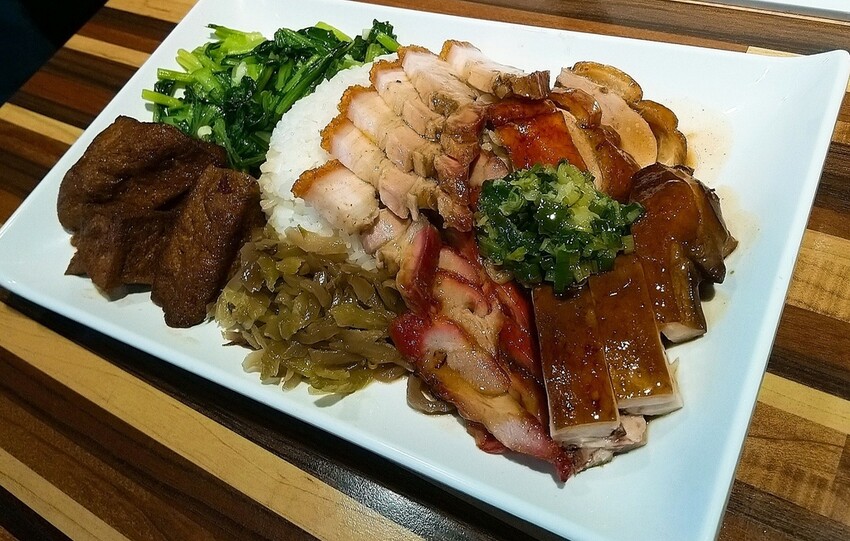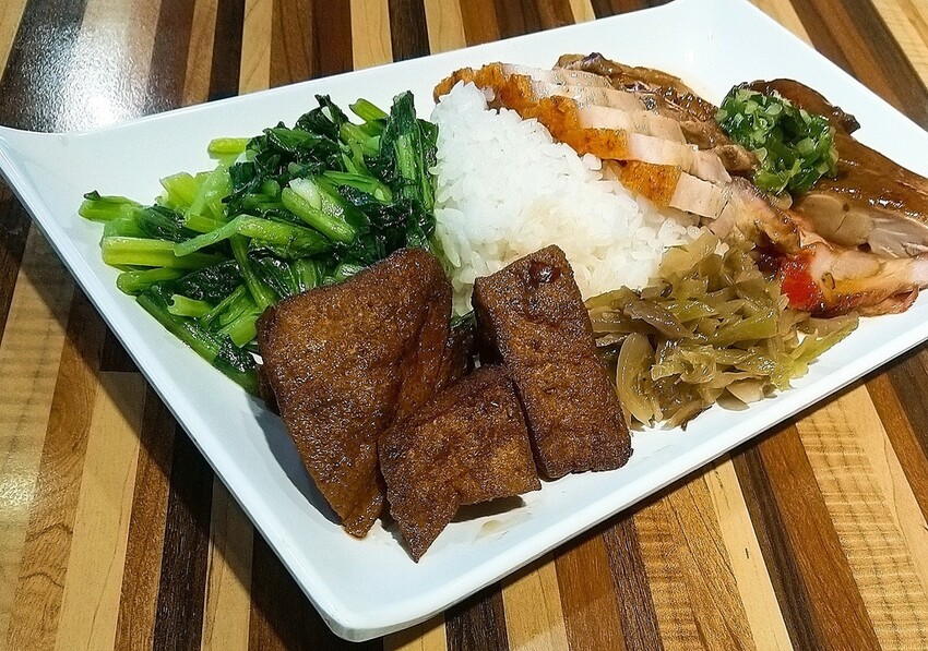 我點三寶飯(叉燒+油雞+燒鴨)加燒肉,豐富的份量根本就吃不完,淋上極有誠意的油蔥醬,油雞鮮嫩多汁又齒頰留香,鴨肉油脂極為豐富,吃起來軟嫩又Q彈的口感讓人回味無窮,煙燻燒鴨特別令人滿足,大呼過癮,更是華人的情意結,每個人都很愛吃燒臘!