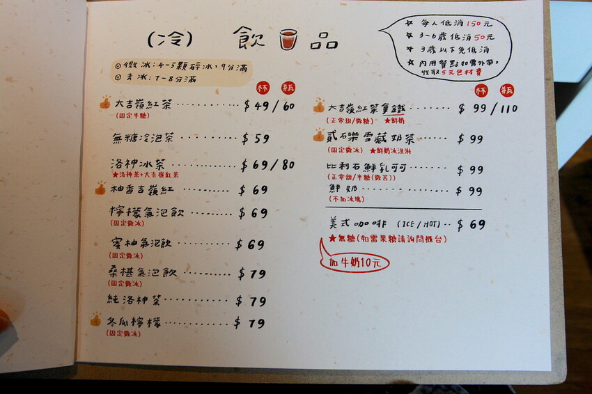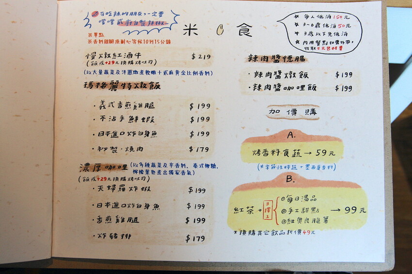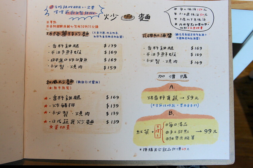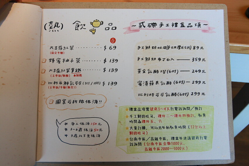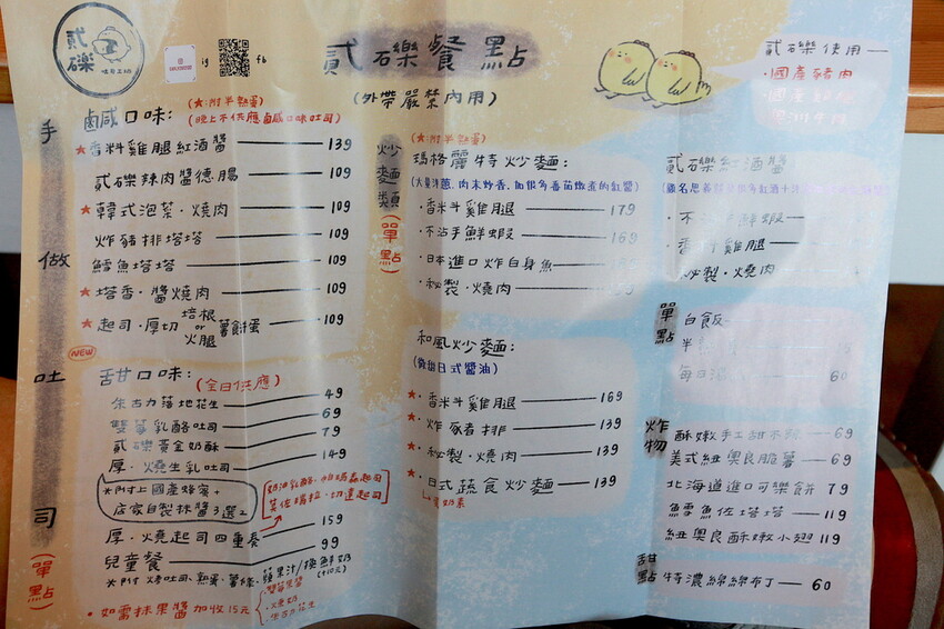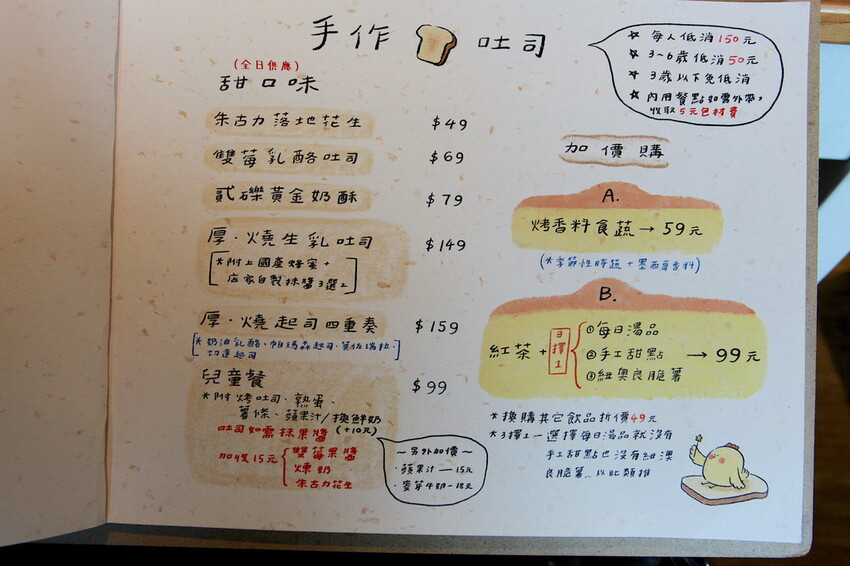 這本設計很活潑菜單供顧客點餐參考,菜單主要分類有炒麵類、米食類、飲料類、手作吐司類、炸物類、甜點類、單點類及禮盒類...等等,餐點可選擇加價升級套餐,整體菜色種類很多定價是很親民。