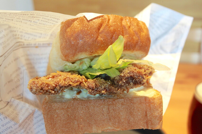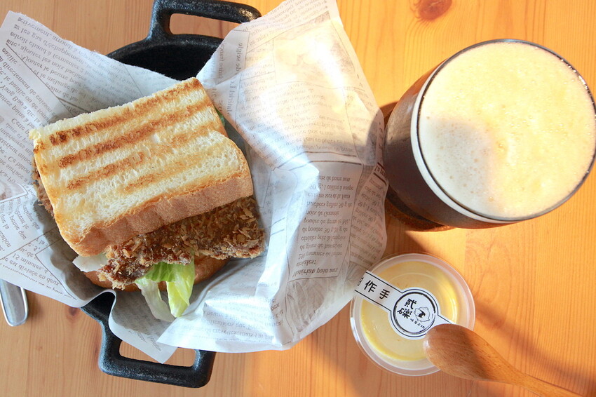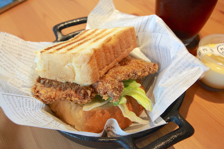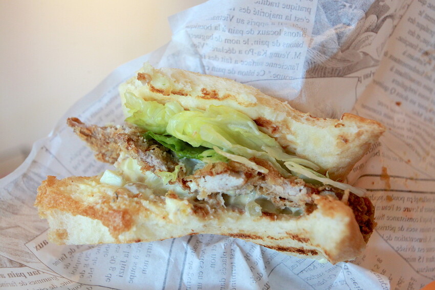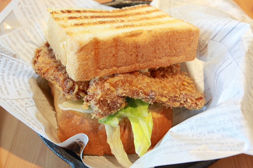 這厚片吐司有烤過表面呈現酥脆焦香,中間夾著有炸豬排、美生菜及沙拉等。