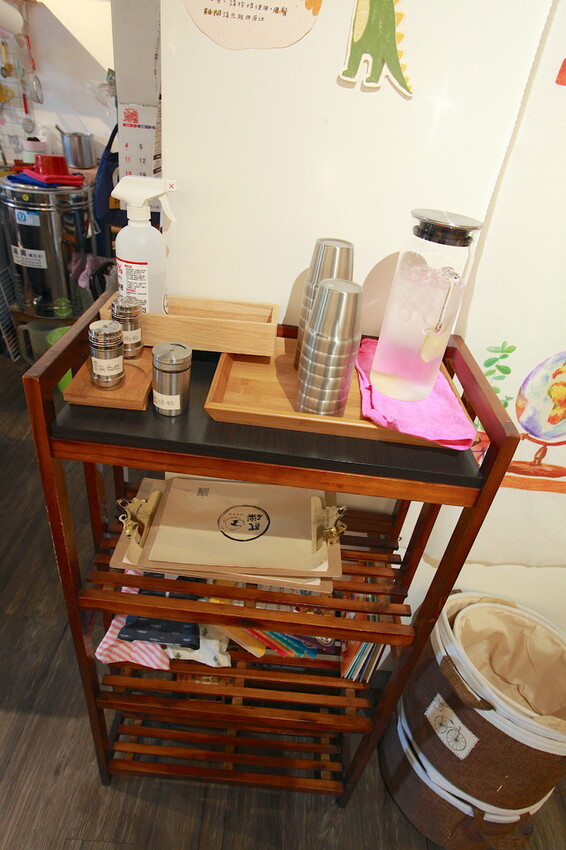這櫃子菜單、茶杯、佐料及茶水供自取使用。