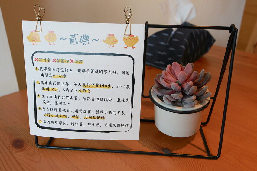 桌面上放置這鐵件有用餐規則供參考,上面有掛著很可愛的多肉植物很解憂。