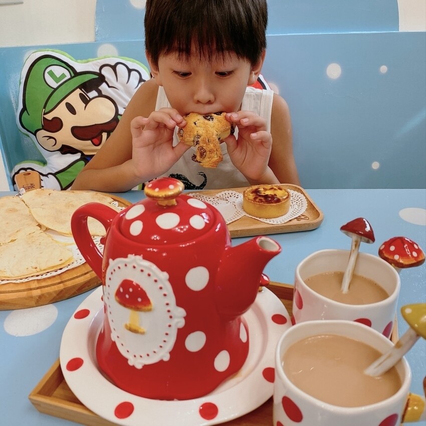 蘑菇特調英式鮮奶茶搭配可愛的茶壺,邊倒邊享用,連自己都覺得自己優雅~