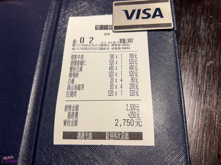 四個人來用餐一共花了2500元,再加上一成服務費共2750元,價格不算便宜但還可以接受。