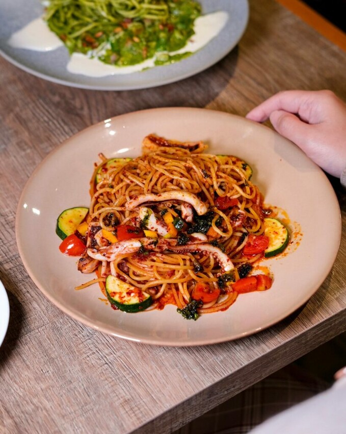 ▼紅通通的韓國辣醬魷魚義大利麵,加入蒜片、韓國辣醬、魷魚、櫛瓜等食材拌炒,最後再灑上韓國海苔絲點綴加分,辣中帶甜的調味相當涮嘴,就很像在韓國吃的辣魷魚絲小菜,麵條吸附了滿滿的醬汁,Q彈不軟爛,搭配著魷魚鬚的嚼勁食感,會讓人著迷一口接一口的吃!