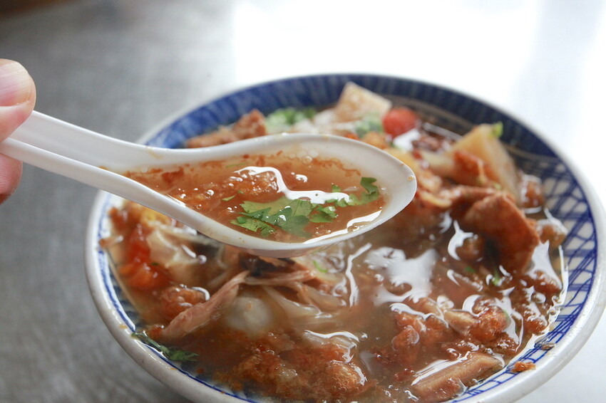 這菜尾湯頭很甘甜不油膩好喝,裡面有雞肉、白菜、筍子、魚丸、炸豬皮.....等等,這些配料合在一起很開胃好吃