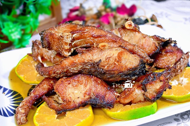 在切片的新鮮柳橙上擺好浸泡過醬油湯汁的炸魚塊,上海燻魚就可以~華麗登場