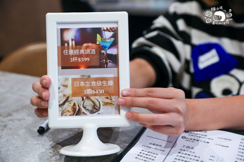桌上的小立牌寫個活動,任選經典調酒三杯599元還有日本生食級生蠔5顆450元,很適合約喜歡小酌的朋友來暢飲,像我一個人酒量不多就很難湊到三杯啦!