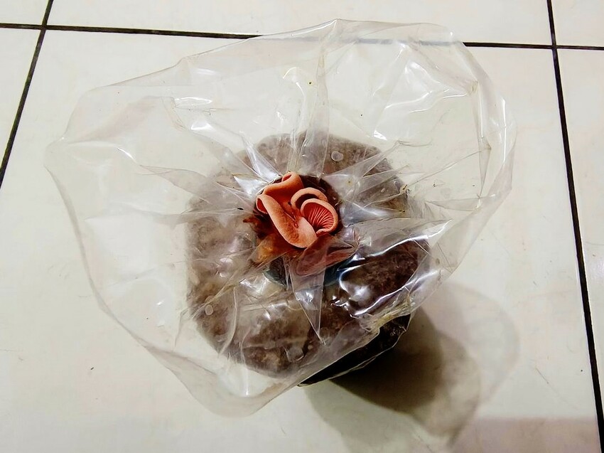 昨天看到帶回家一週的玫瑰菇太空包竟然冒出漂亮的粉紅菇菇🍄