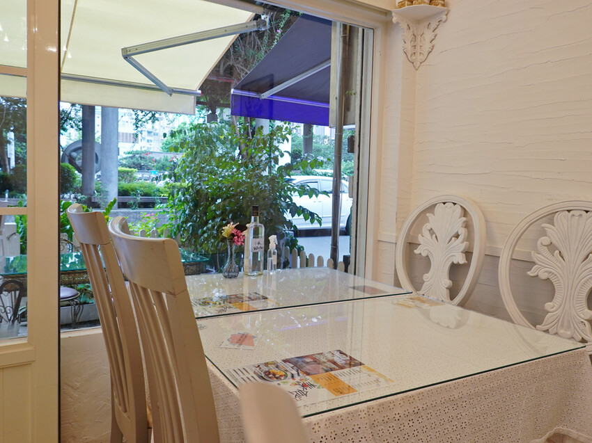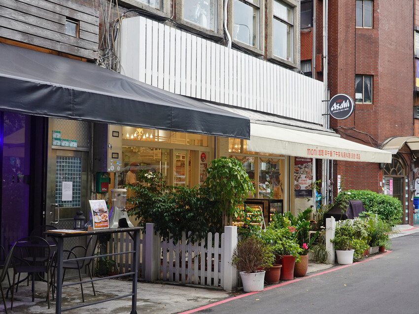 「Moni 咖哩」的裝潢走的是歐式鄉村風格,門面以白色為主要色系,搭配綠意植栽。