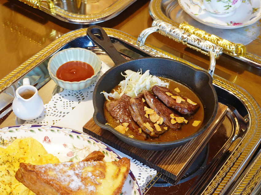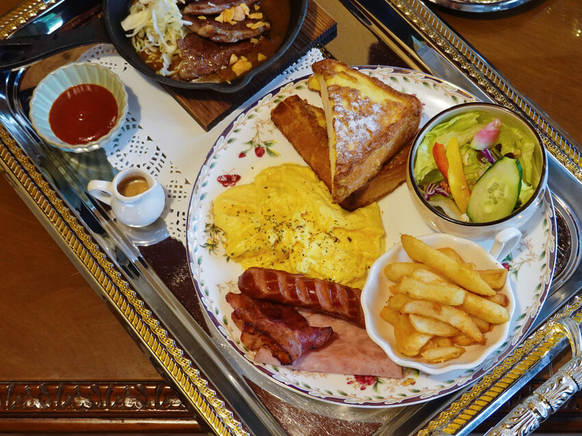 如果想要更有飽足感些,早午餐就更為適合,相較於輕食,又多了薯條、培根、徳腸、火腿,盛裝在銀製托盤上更顯豐盛且貴氣逼人。