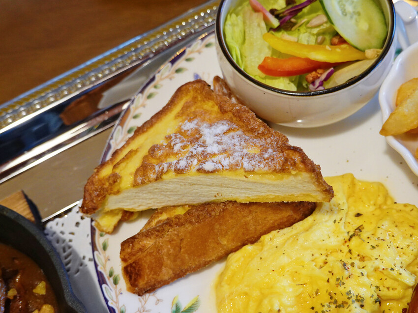 有別於一般浸泡的完全濕潤的吐司,「Moni咖哩」的僅有表層裹上蛋液,以致於在口感上不會過於濕軟,裏層仍保有吐司本身的蓬鬆。
