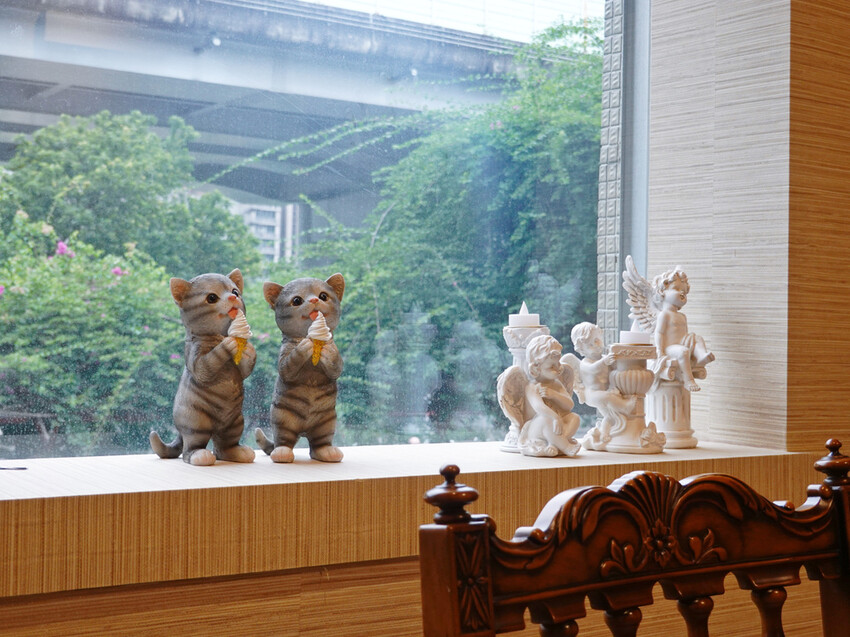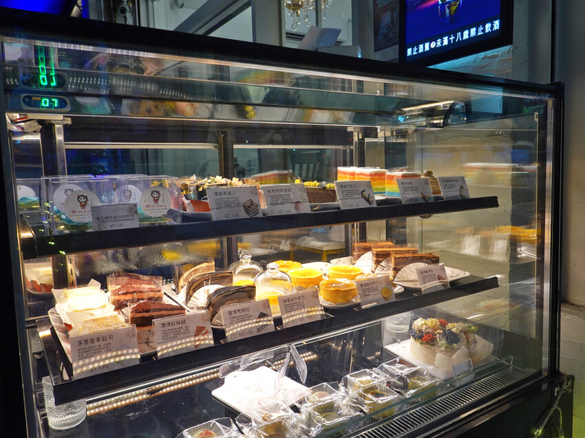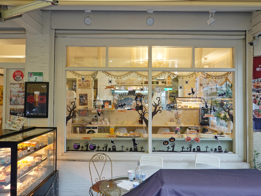 而最吸睛的,莫過於擺放於露天座位區的甜點櫃,裡頭擺放著十款以上的糕點,還有老闆娘最引以為傲的金莎擠花,像個藝術品般的收藏在櫃內,等待欣賞它的人將它摘下。