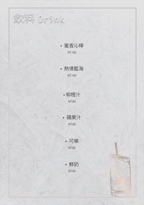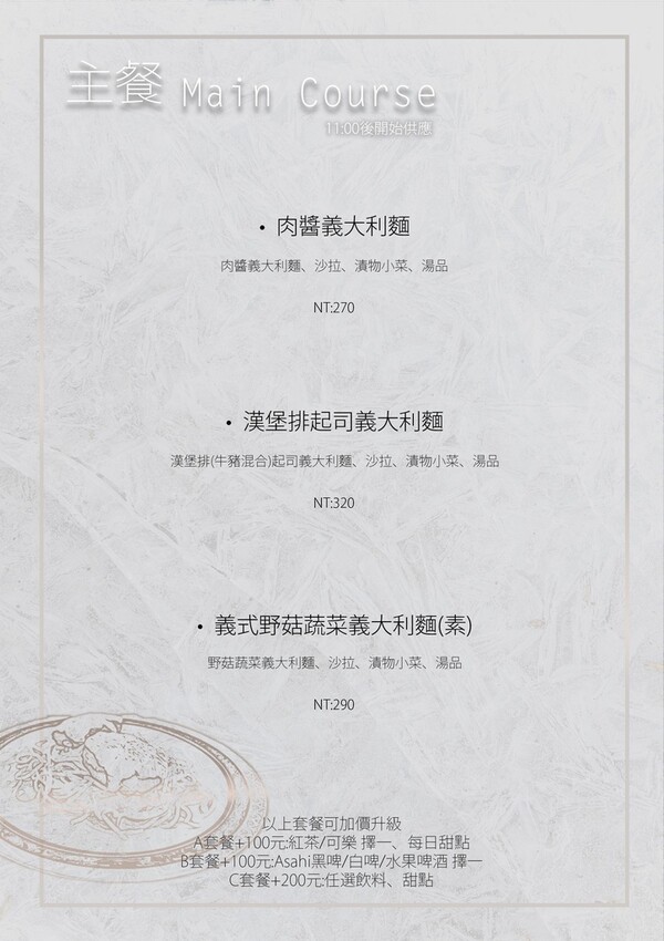 牛小排/麵包/歐姆蛋/薯條/沙拉/培根/火腿/德腸/紅茶或咖啡