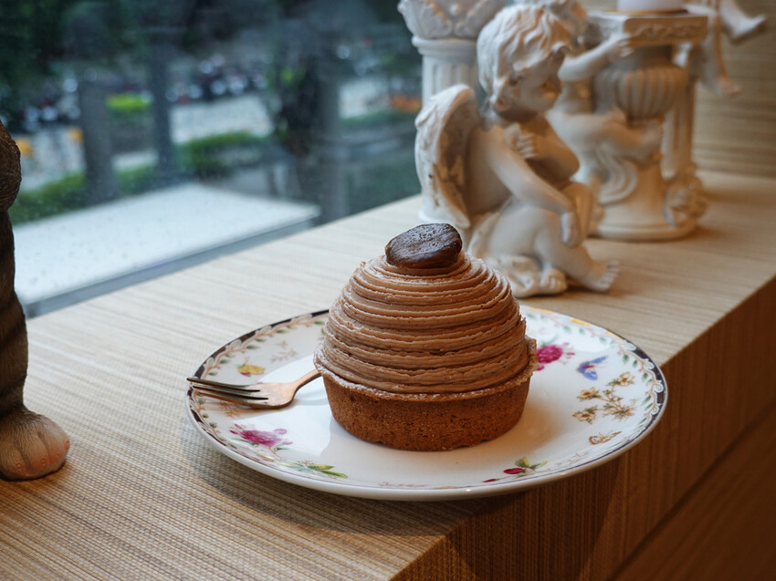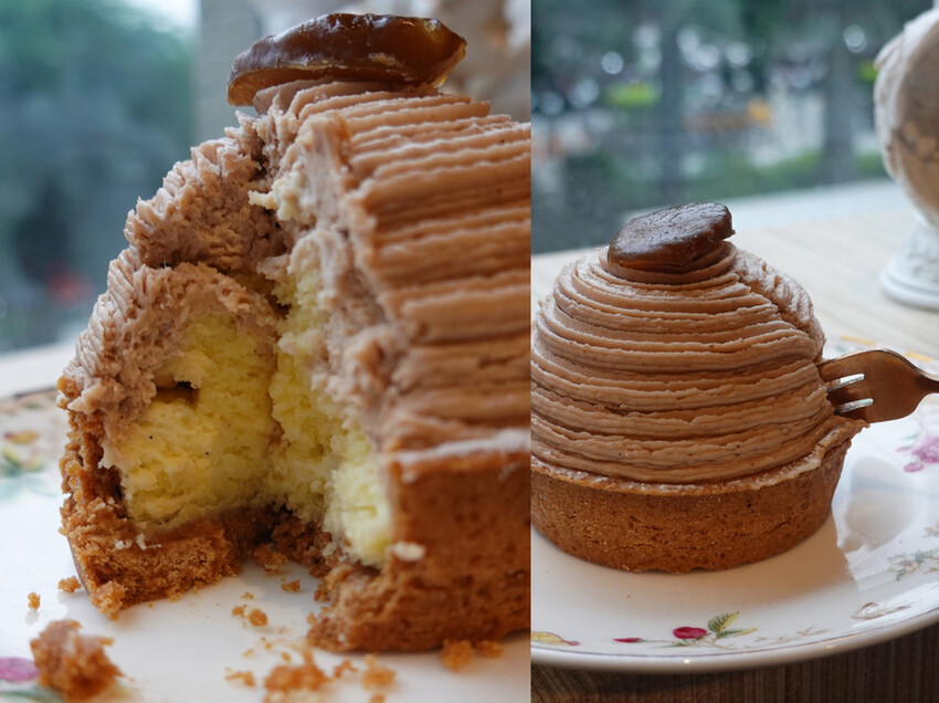 法式栗子蒙布朗,裡層的杏仁餅乾、甘納許和栗子卡士達清爽不膩口,圍繞的沙巴東栗子餡甜度也恰到好處,綿密且滑順。