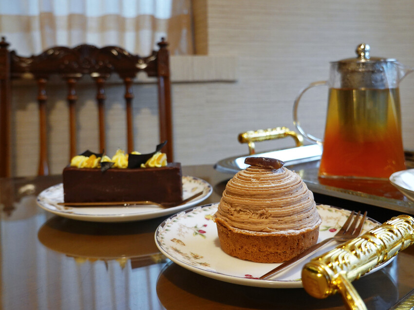 兩款蛋糕,我分別選擇了法式栗子蒙布朗跟橙香巧克力。