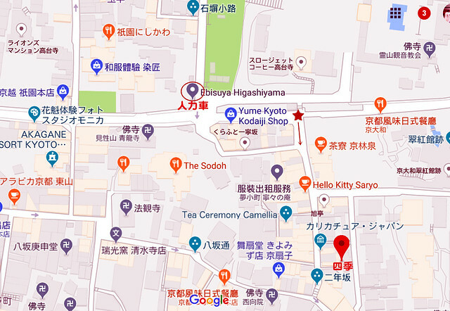 清水道四季櫻花位在清水寺二年坂,來看一下位置圖,