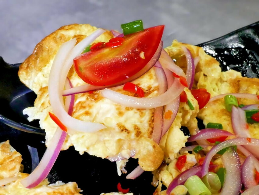 烘蛋的外皮被烘的很香酥. 咬起來保有澎澎的軟嫩口感. 火候掌握的十分得宜. 鋪上色彩繽紛蔬菜. 上桌後更加搶眼. 讓人看了想立刻開動. 帶有視覺了/味覺雙重享受!