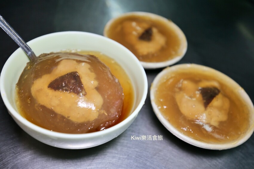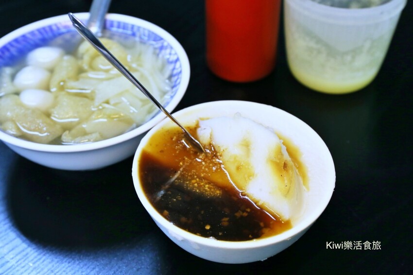 南北碗粿各有千秋,碗粿的質地開始在來米浸漬溪水後再磨漿,糊化後就就會變成潔白Q彈的粿體,賣碗粿的老闆熟捻的直接拿起器具在碗粿邊緣刮了一圈後,在倒扣出來,林上自家製作的醬汁,一顆顆碗粿就這樣端上桌囉!