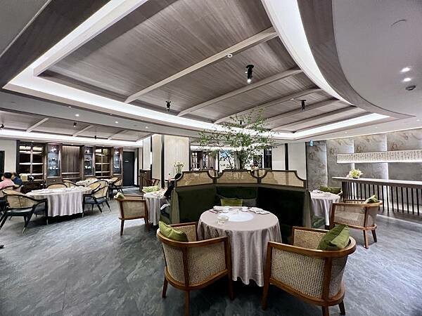 在近百坪的用餐空間風格簡約中帶有東方色彩和一抹綠意,