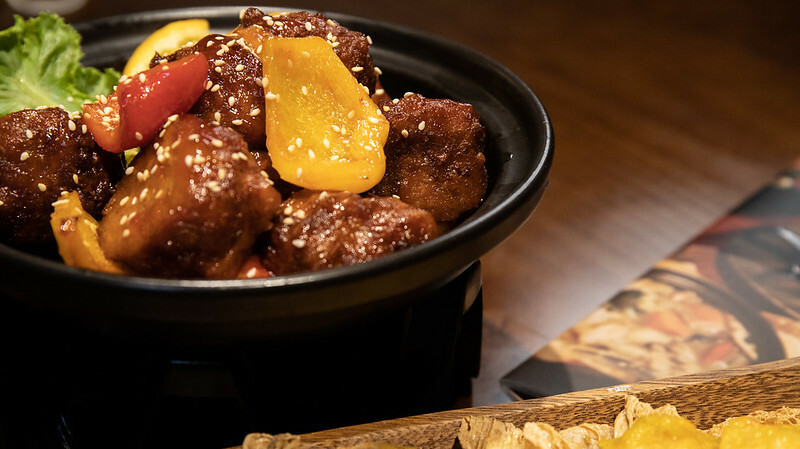 植物肉+油條手拍出超大"排骨"的外型酥炸定型後再佐上糖醋醬汁,最後還需要一點烤功讓透亮焦糖完全沾黏在植物肉排骨,吃的到排骨肉鬆軟口感,裡面的油條,還保留著一點油條特有口感!