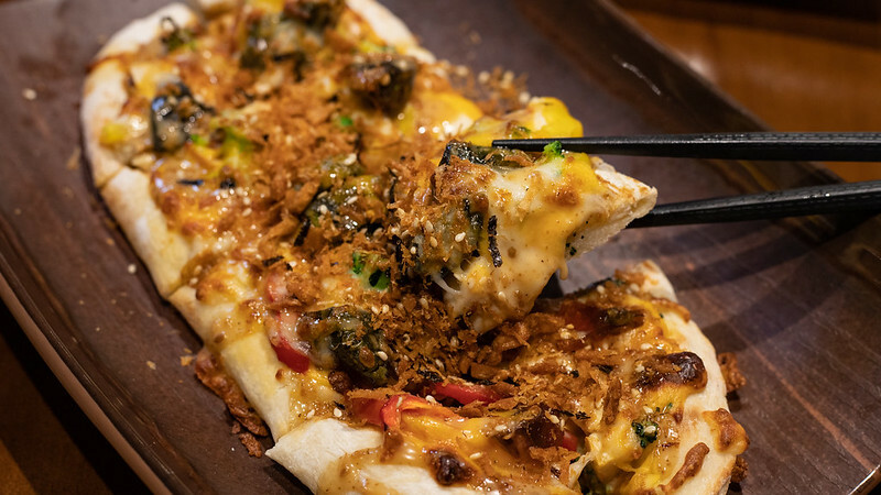 義式手工PIZZA餅皮(厚實有咬勁) 起司 甜椒 皮蛋滿滿,非常皮….醬汁選擇上也很特別類似胡麻醬,將皮蛋特有的口感變得更溫順