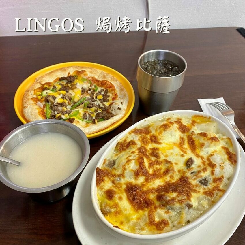 位於台北車站Y區地下街的北車餐廳Lingos焗烤披薩是不少台北人從小吃到大的美味,200元不到就能飽餐一頓的焗烤披薩還附贈湯和飲料,伴著學生度過苦澀青春。 焗烤馬鈴薯牛肉飯料足香氣夠,是不少學生的平價必點招牌,比薩口味的選擇多,有分兩種大小尺寸(7吋/10吋), 可以根據每個人的食量或用餐人數來選擇,披薩都是薄的餅皮,喜歡酥脆口感的饕客可以試試。