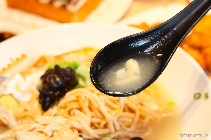 ▼事先以花雕酒醃過的無骨雞腿肉,入味軟嫩,咬下包覆在雞腿肉內的湯汁滲出,濃郁的香氣迷人,鍋燒的食材新鮮度非常好,木耳、玉米筍、蛤蜊、剝殼的蝦、白菜、豆皮等等,9種配料也很有誠意,吃一碗也讓人很飽足。