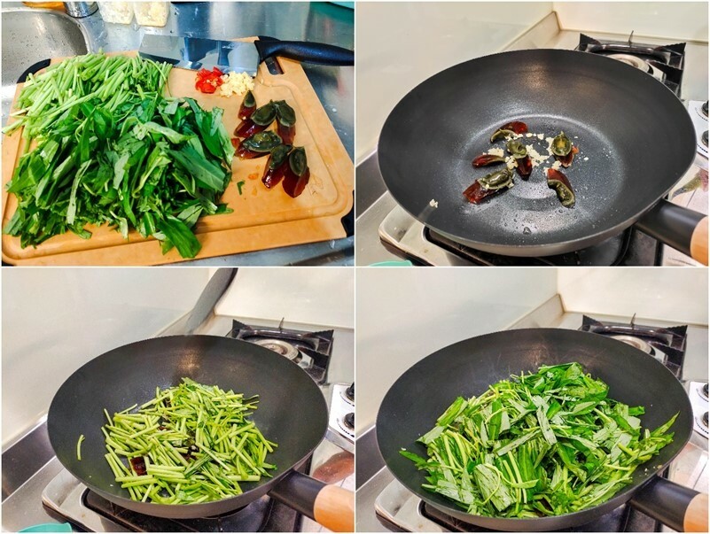 最後加入菜葉稍微將火調大迅速翻炒,鍋子加熱很快,火候更好掌握,炒香鍋氣一下就可以起鍋!比起之前使用厚的大鍋,加熱速度慢,先放入的食才就容易過熟老掉