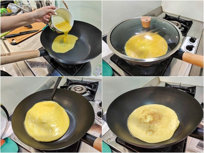 蛋煎熟了之後再包入鮪魚或其他喜歡的材料,蛋包就可以輕鬆上桌啦!鍋子沾上的配料醬汁,只要鍋子冷卻後用水沖一下就可以清洗乾淨!不沾效果相當不錯!