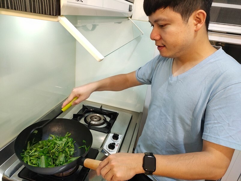 炒鍋首先當然是炒個菜,先將蒜末爆香,加入一點辣椒菜梗翻炒