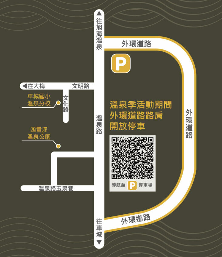 四重溪溫泉公園的停車位數量有限,若抵達時車位已滿,需配合活動現場交通管制路線,把車停放到較遠停車場,或是到外環道沿線停車,提醒大家要預留找車位跟步行的時間哦!