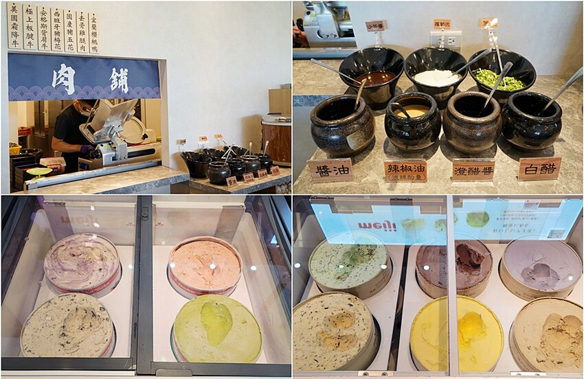 經典七種肉品想再吃需到自助吧肉舖,會有服務人員現切肉品(一人一次選五盤),醬料區有七種可自行調配,吃鍋也少不了最後的甜品加持,這邊除了明治冰淇淋有10種口味可選,還有霜淇淋任你吃到爽唷!