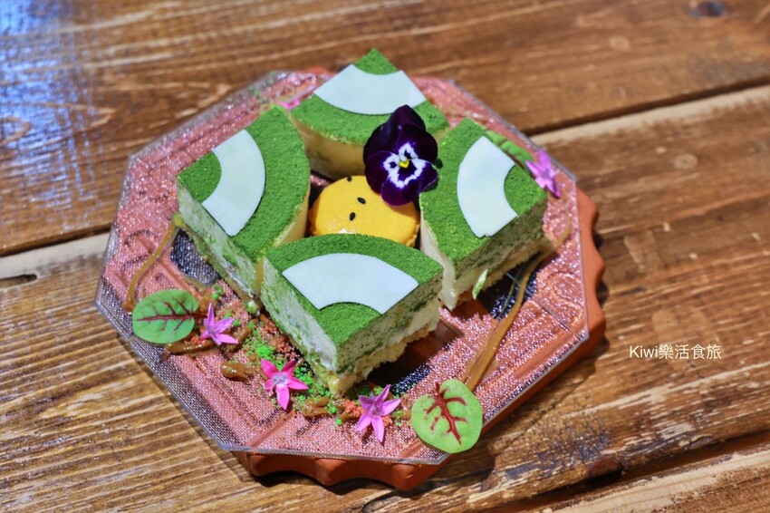 LeeLis窗櫺下午茶,內容物有生乳酪蛋糕、台式抹茶粉、紅酸膜、美女櫻、石竹、焦糖化牛奶糖,中間的馬卡龍很酷也很特別,整個味道挺棒,很推薦這道甜點。