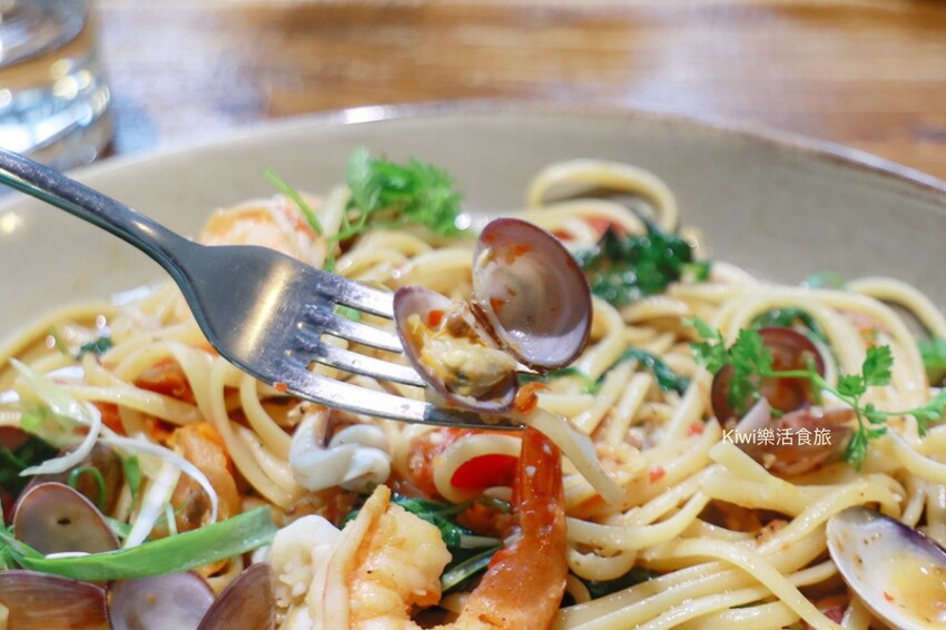 LeeLis餐點現點現做,這道鹿港海鮮市場義大利麵很夯,也是店裡招牌之一,將蝦猴醬炒入義大利麵中,很特別耶!