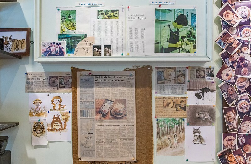 牆上貼滿了各式各樣客人客製化的拉花咖啡,可以說只要有照片老闆就能做,至於價格依難易度現場開價,標配立體柴犬則是350元,也有貓和熊的選擇。