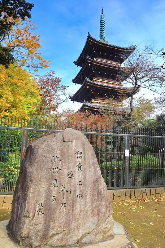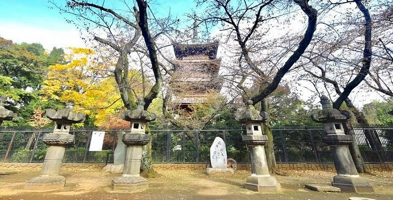 走在上野公園,你很難不發現舊寛永寺五重塔的存在,江戶時代,三代將軍德川家光在江戶城丑寅(東北)方,也就是所謂的鬼門,建立東叡山寛永寺。之後,寛永寺與芝的增上寺並列為將軍家的墓所。舊寬永寺五重塔初建於1631年,並於1639年重建。高度從地面到最頂端的寶珠處共高36公尺,為當時傲視群雄的五層樓建築。戊辰戰爭,堅守寛永寺的舊幕府軍彰義隊在此地遭到新政府軍包圍殲滅(上野戰爭)、伽藍燒毀,這一帶成為廢墟。第二次世界大戰空襲更導致了許多建築燒毀,現在僅有數棟古蹟建築,包含五重塔及一排排石燈籠。
