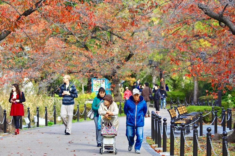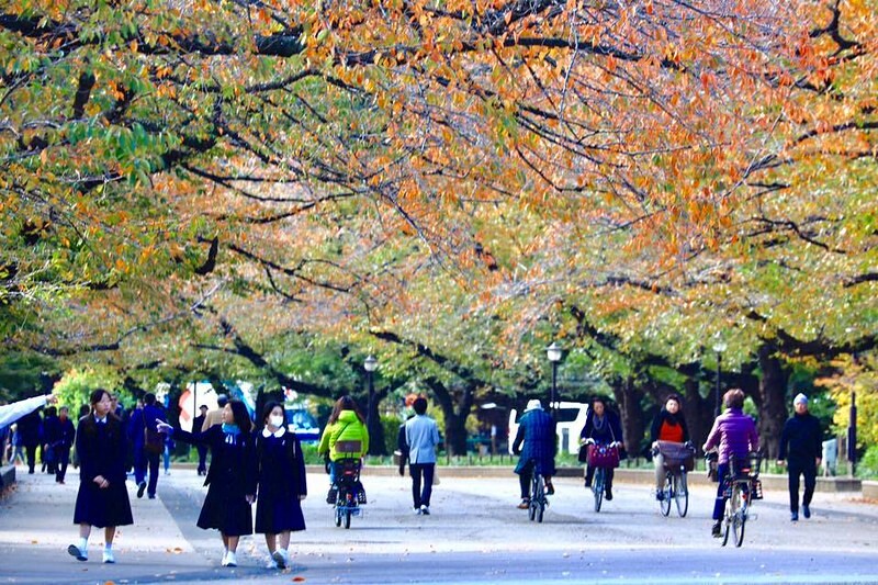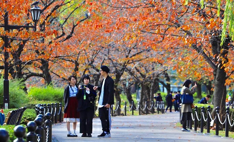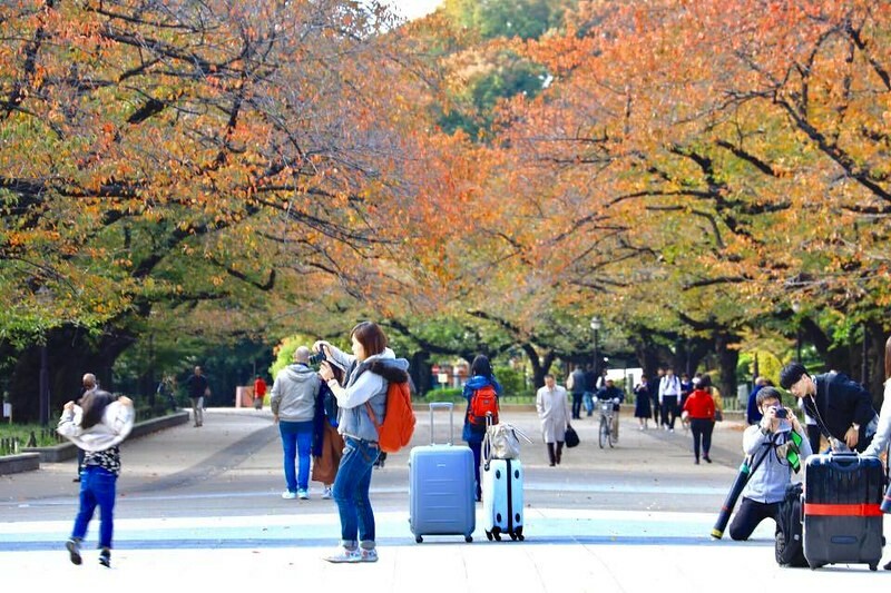 上野公園從每年十月中下旬到十一月中下旬都是欣賞紅葉的好時間,期間公園內常見的就是剛下飛機,或是要到機場的遊客,拉著行李便在公園內拍照,這風情也是其他公園少見的。