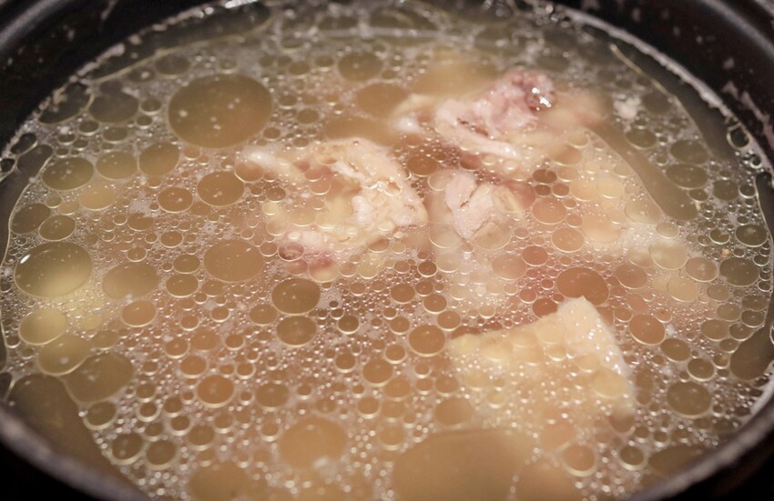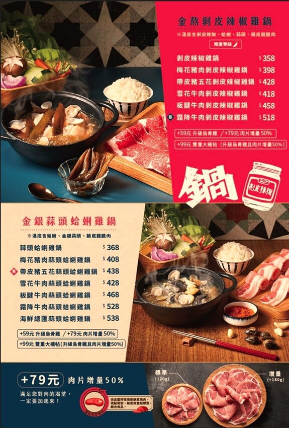 有金敖剝皮辣椒雞、金銀蒜頭蛤蠣、酒香薑煸麻油、辣子爆雞以及經典石頭火鍋可以點選,我們的雙人套餐湯底是金敖剝皮辣椒雞以及經典石頭火鍋來做鴛鴦;另外的個人鍋則是金銀蒜頭蛤蠣及經典石頭火鍋。