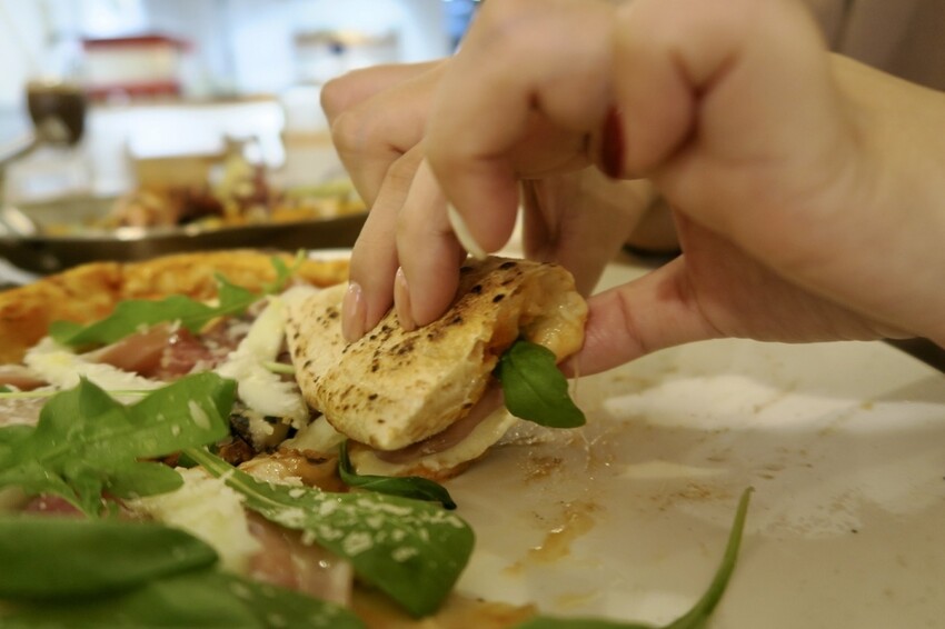 爐烤義式薄片的披薩鋪了滿滿生火腿、起司、芝麻葉