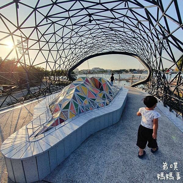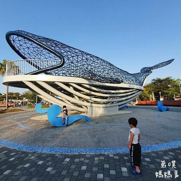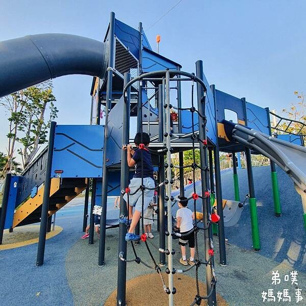 港濱歷史公園實際整個範圍超級大,遊戲場在正中間,先分享一下"港濱歷史公園"遊戲場,是台南市第一座結合公眾參與的共融遊戲場示範場域,也是台南最大的特色公園,整座公園以「深海歷險趣」為主題,並把公園位在港濱的特色,劍獅意象、海洋的小鯨魚到大鯨魚、珊瑚礁融入公園。