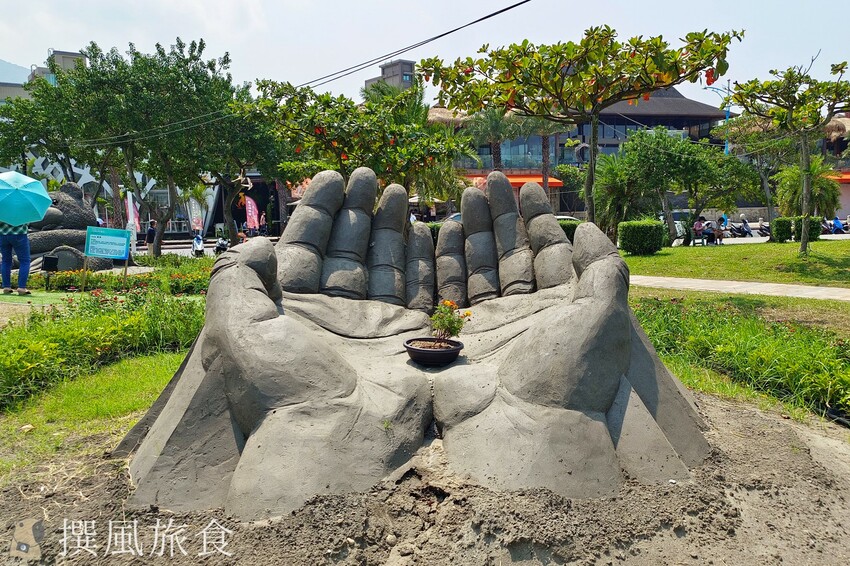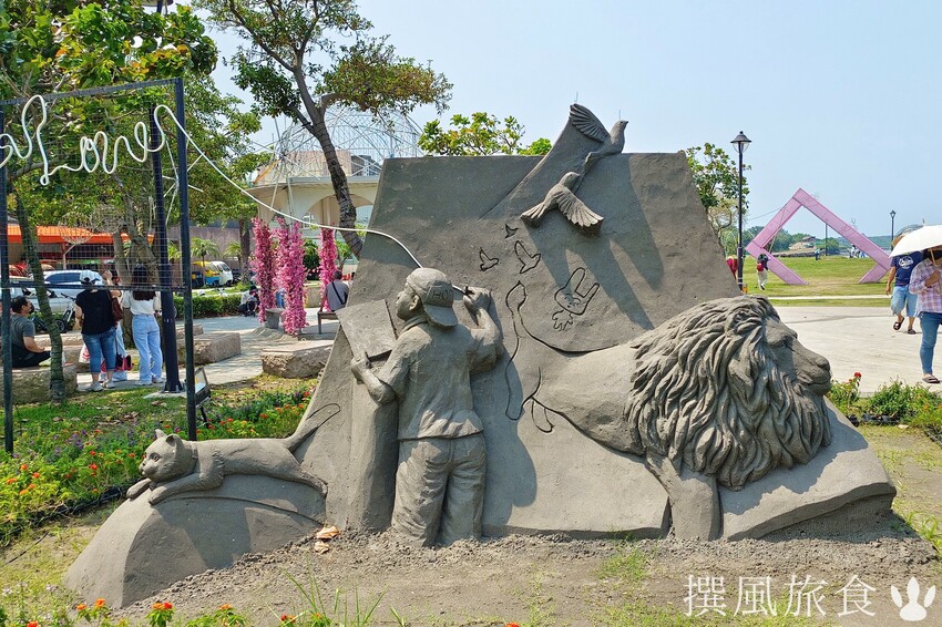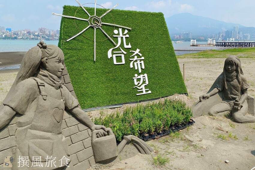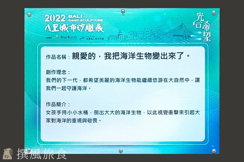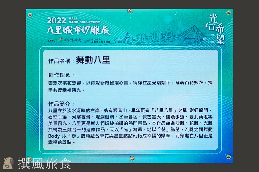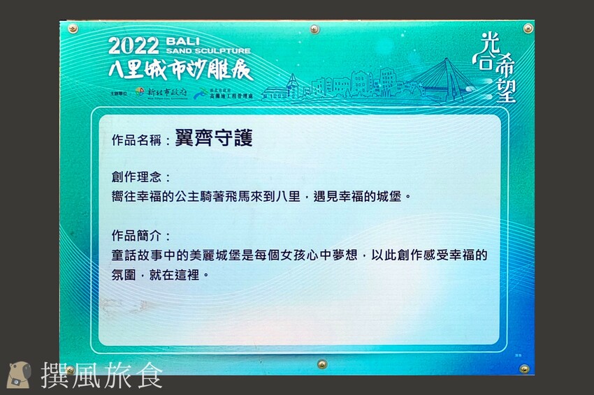 來看看這次重點2022八里城市沙雕展,撰風為了儘量避開人潮,因此選擇中午時段前來,此時非常的曬,到晚上搭配光雕展,那就會變得水洩不通,還是要有防疫的考量,最終決定給太陽曬一曬好了。2022八里城市沙雕展活動時間為2022/8/13~10/11,主題為「光合希望」,並以消失的病毒為發想,鼓勵後疫情時代可以多出門走走。本次共計16座沙雕作品展。