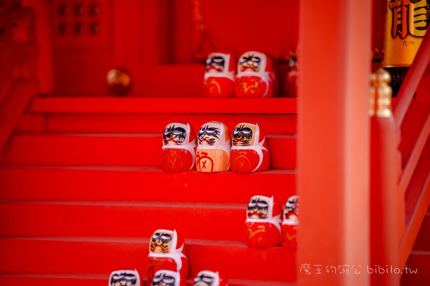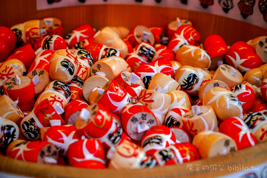 這就是小達摩本尊,在日本,達摩被稱為夠帶來幸運的吉祥物,所以整座寺廟內都處都能看見來此許願的遊客們所放置的小達摩們,要放在哪裡,沒有限制,上面的小達摩是木雕喔,有紅色跟白色,一顆500日幣,大家可以到最上面的本堂購買,然後記得拿去許願過香後,可以選擇要帶回家還是放在寺廟內都可以的,這尊小達摩長的有夠醜萌,每一顆的表情有都不太相同。