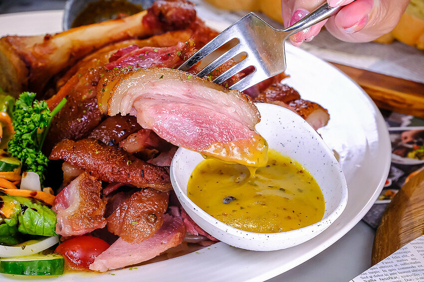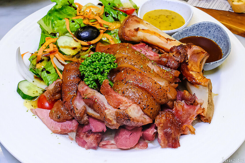 雛菊見的特色菜也很值得品嚐,德國豬腳是先用啤酒醃漬後再加入水果、蔬菜一起燉煮,搭配油醋醬沙拉,並且附上義式烤肉醬、蜂蜜芥末醬可以沾德國豬腳。